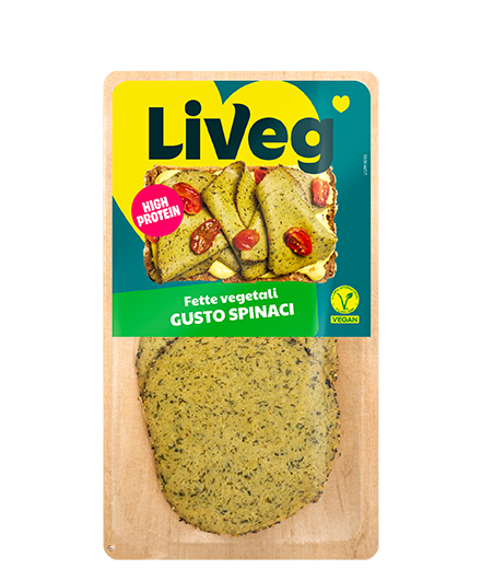 Ingredienti : Glutine di grano 27%, tofu 19% (soia, acqua, coagulante: cloruro di magnesio), acqua, spinaci 13%, basilico, olio di semi di girasole, aroma naturale, lievito inattivo, sale, destrosio, antiossidante: acido ascorbico; pepe nero, fibra di pisello, cipolla, correttore di acidità: acido lattico; aglio, rosmarino, timo.o